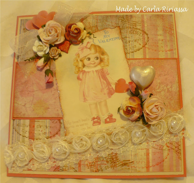 Love is in the air, nou bij mij al meer dan 30 jaar. maar dit terzijde! Ik kwam dit valentijnsplaatje op het internet tegen, is het geen "Lieffie"? Het papier , bloemen, hartjes , lint  ect. is uit eigen voorraad en de poststamp stempel ( op de achtergrond ) is van Kaisercraft.